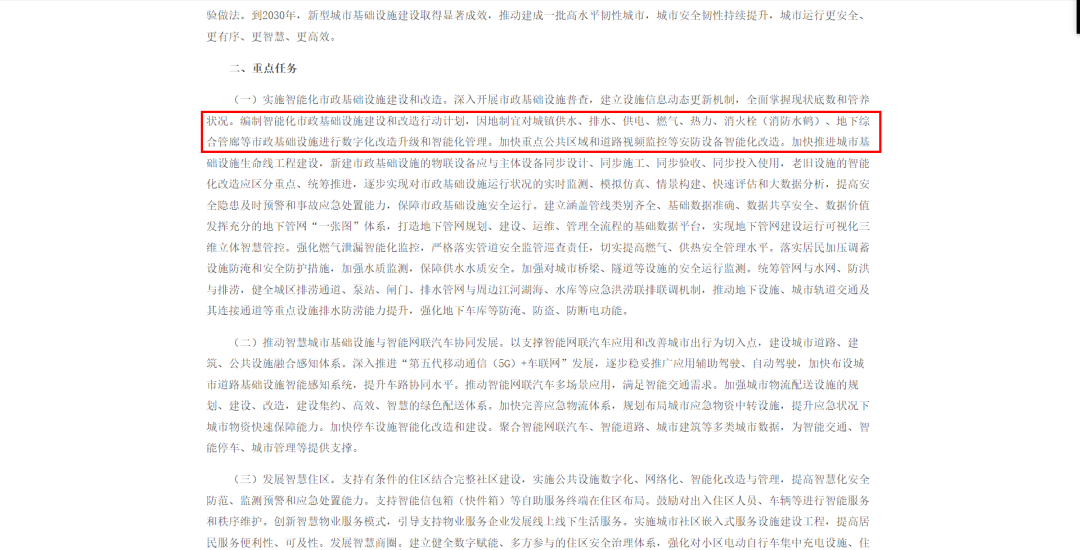 重点任务之一就是实施智能化市政基础设施建设和改造。深入开展市政基础设施普查,建立设施信息动态更新机制,全面掌握现状底数和管养状况。编制智能化市政基础设施建设和改造行动计划,因地制宜对城镇供水、排水、供电、燃气、热力、消火栓(消防水鹤)、地下综合管廊等市政基础设施进行数字化改造升级和智能化管理。建立涵盖管线类别齐全、基础数据准确、数据共享安全、数据价值发挥充分的地下管网“一张图”体系,打造地下管网规划、建设、运维、管理全流程的基础数据平台,实现地下管网建设运行可视化三维立体智慧管控。强化燃气泄漏智能化监控,严格落实管道安全监管巡查责任,切实提高燃气、供热安全管理水平。
